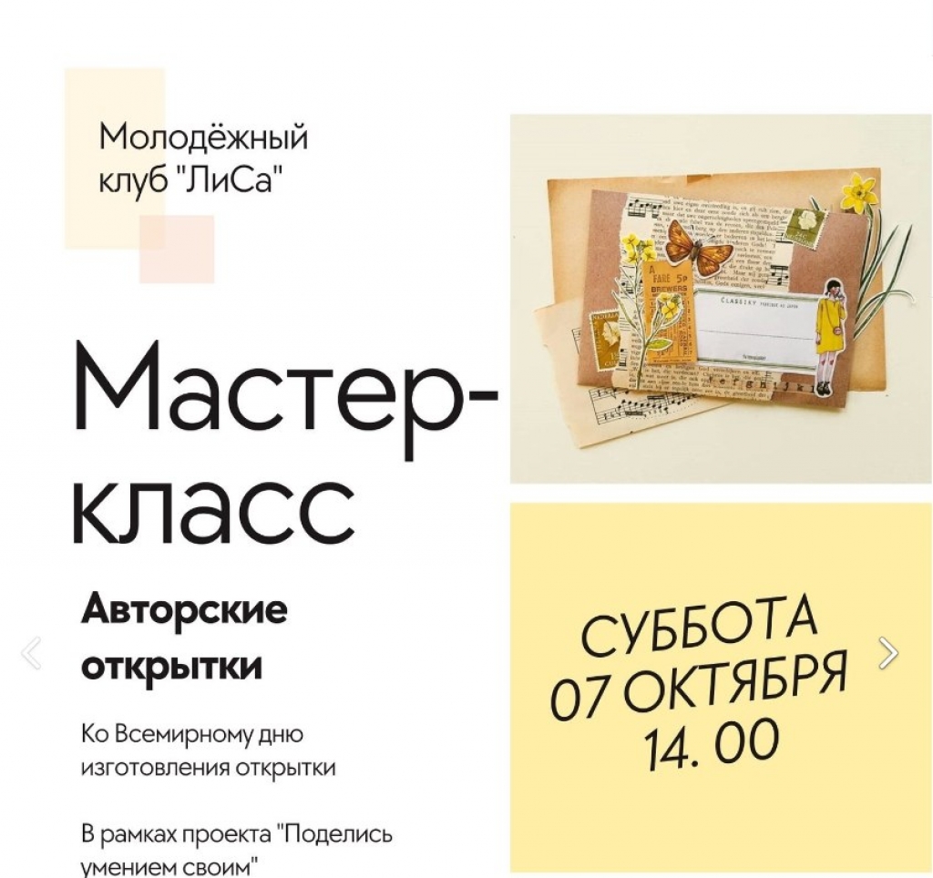 Его участники вместе с волонтерами молодежного клуба "ЛиСа" будут мастерить авторские открытки во Всемирный день изготовления открыток.