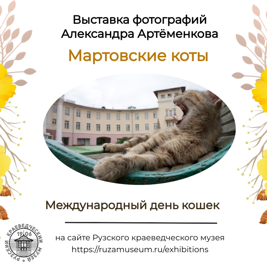 На сайте Рузского краеведческого музея открыта выставка фотографий «Мартовские коты», приуроченная ко Дню кошек. Этот праздник отмечается в России ежегодно 1 марта. Автор работ – Александр Артёменков.