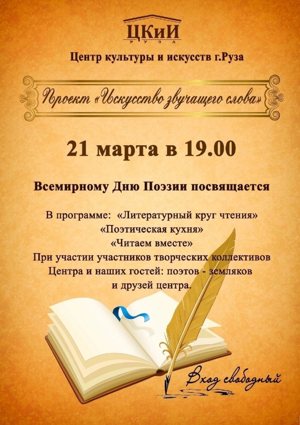 21 марта в Рузском центре культуры и искусств состоится проект «Искусство звучащего слова», приуроченный ко Всемирному дню поэзии.