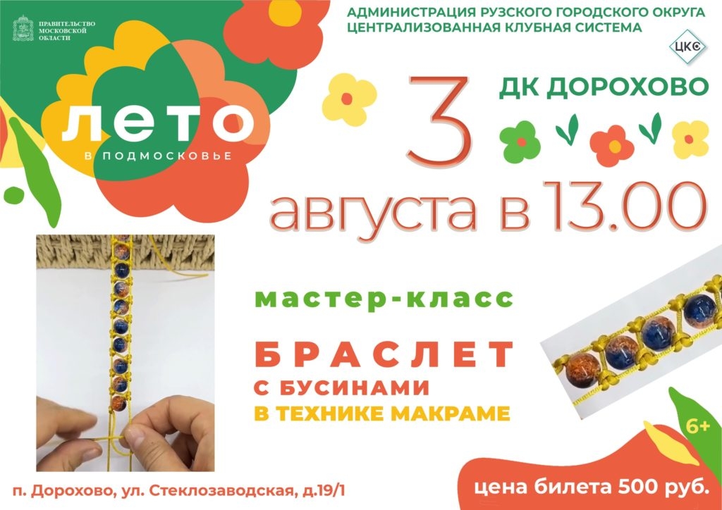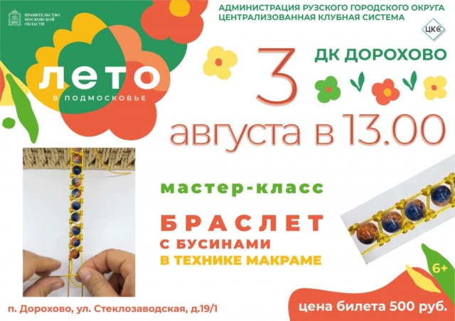 3 августа в Дороховском доме культуры Рузского городского округа состоится мастер-класс по изготовлению браслета с бусинами в технике макраме.